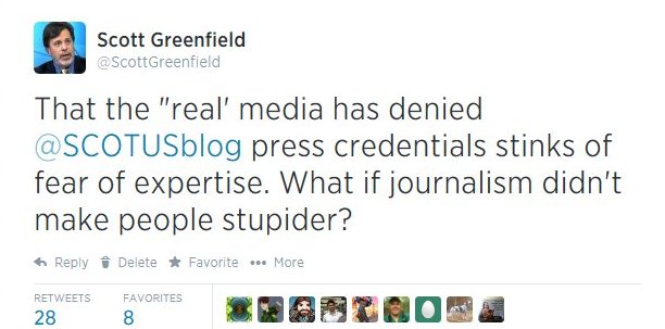 SCOTUSBlog offers something completely different. Actual expertise in its subject matter. The cry that Goldstein may not be independent, or may have ulterior purposes (such as marketing his Supreme Court practice) may be accurate, but irrelevant. Journalists know this, and it scares the living daylights out of them. Their refusal to let Goldstein into their self-important ranks drips with fear and loathing.